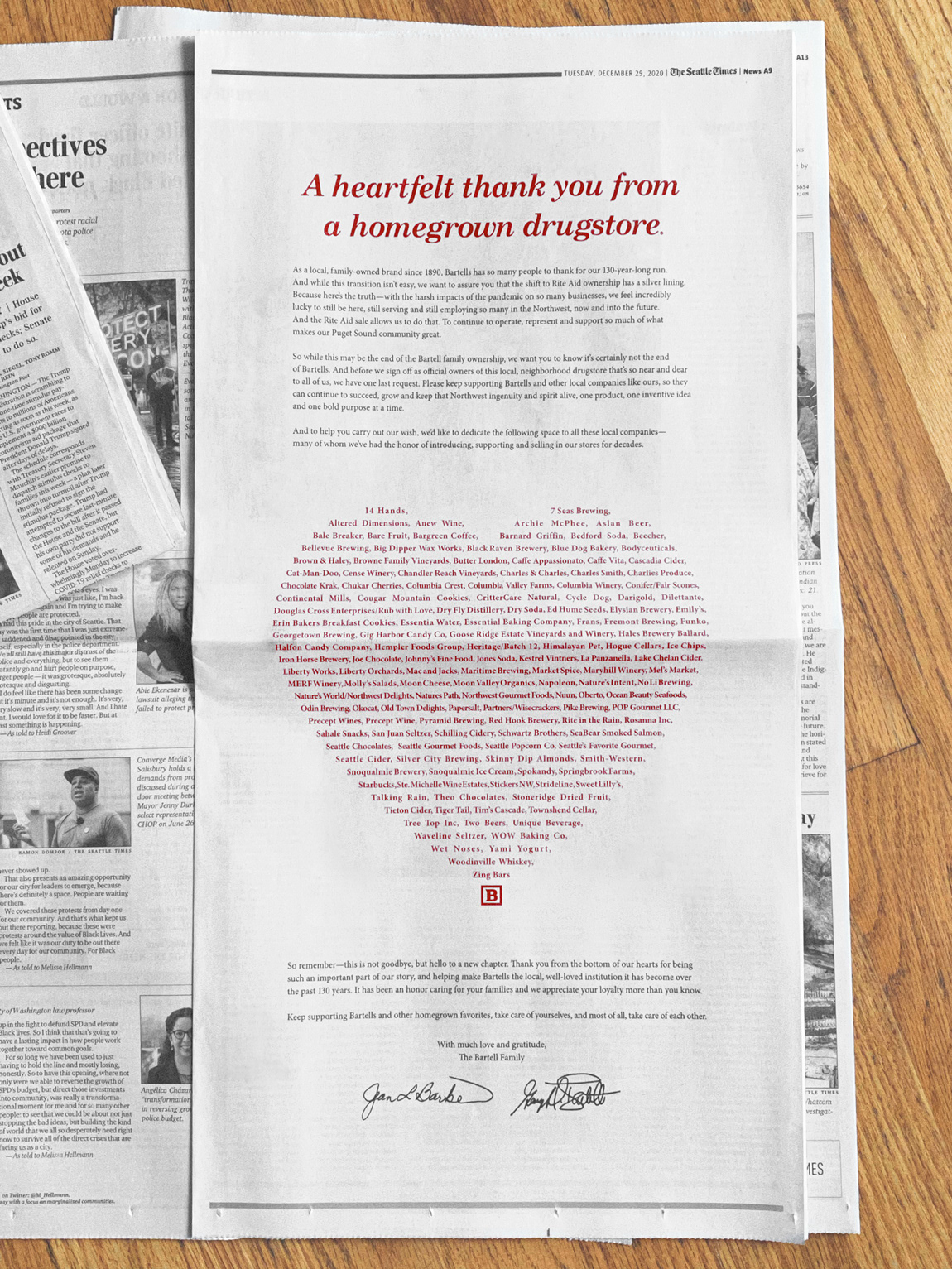 Bartells, and the Bartell family were a northwest institution. And the oldest independent Drug store in the US. They had a very large and very loyal fan base. We saw it only fitting then, for them to step away with a well-written, signed, full-page farewell.