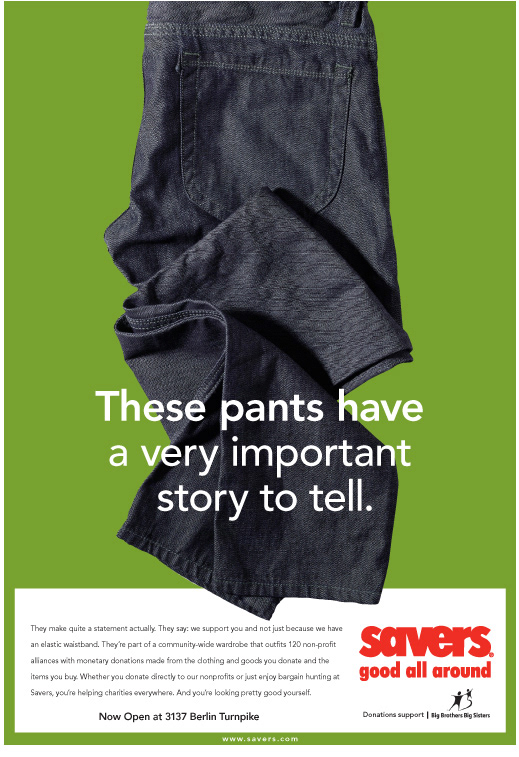 Savers also makes a healthy profit. And these ran following grand openings to help drive donations. We were very careful not to state that when you buy, the charity benefits. It's when you donate items that they earn funds. There were many discussions about the implications of appearing to be raising money for non-profits with sales. But somewhere along the way, after I was no longer working with them, someone got the idea that the campaign needed a more "retail" call to action. And "Donations support" was changed to "Your shopping and donations support."